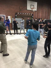 Dr. Brown teaches a tapping sequence to men and boys who are refugees from five Middle Eastern Countries living in a Berlin shelter.